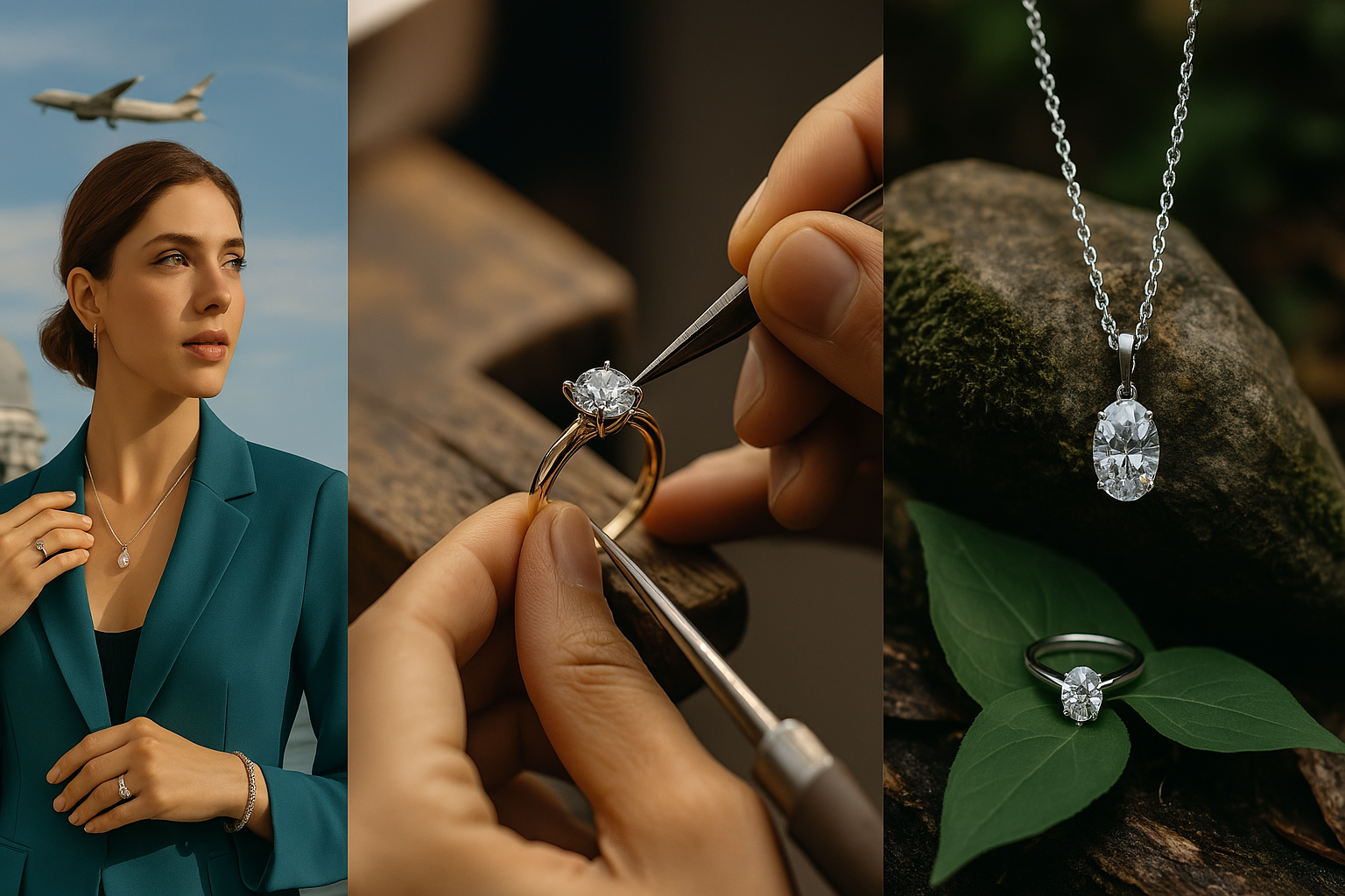 Jewelry crafted for the bold, the global, the conscious. Exquisite lab-grown diamonds set in real gold — designed to travel with you, worry-free.