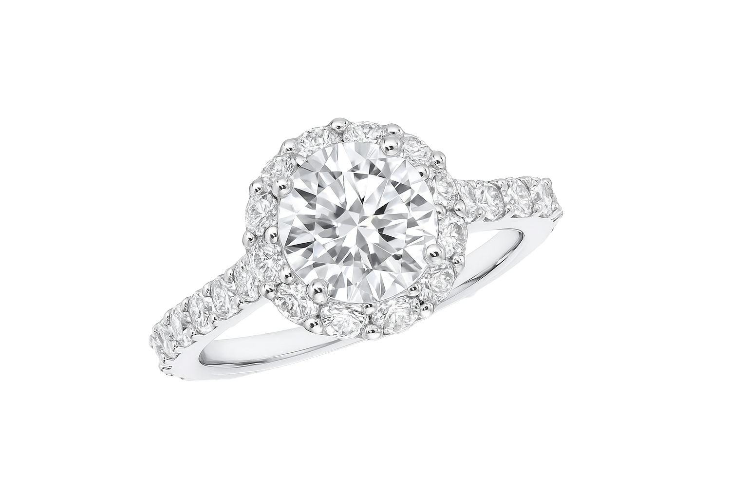 Details • Diamond Shape: Round Brilliant with Halo • Approximate Diamond Weight: 2.5 carats (total) • Metal: 18K White Gold / Yellow Gold / Rose Gold (available in 14K gold or Silver on request) • Average Color: E-F • Average Clarity: VVS – VS